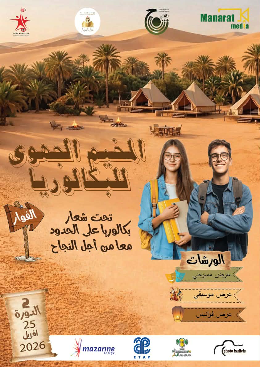 اختتمت أشغال الدورة الثانية من المخيم الجهوي للبكالوريا بمعتمدية الفوار من ولاية قبلي، والذي نظمته جمعية منارات للإعلام السمعي البصري بالشراكة مع المندوبية الجهوية للتربية والمندوبية الجهوية للشؤون الثقافية والمندوبية الجهوية للشباب والرياضة بدعم من المؤسسة التونسية للأنشطة البترولية وشركة “مازارين إينرجي ” تحت شعار بكالوريا على الحدود معا من أجل النجاح”.