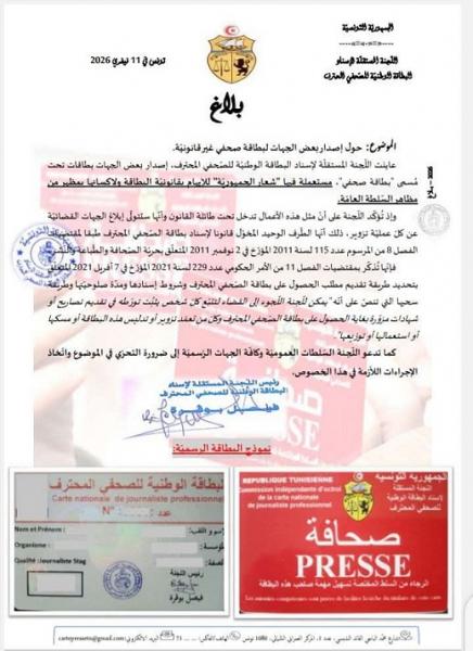Dans un communiqué rendu public le 11 février 2026, la Commission révèle avoir identifié des cartes arborant indûment l’intitulé « carte de journaliste » et reproduisant le sceau de la République tunisienne, dans une tentative manifeste de leur conférer une apparence officielle et trompeuse.
