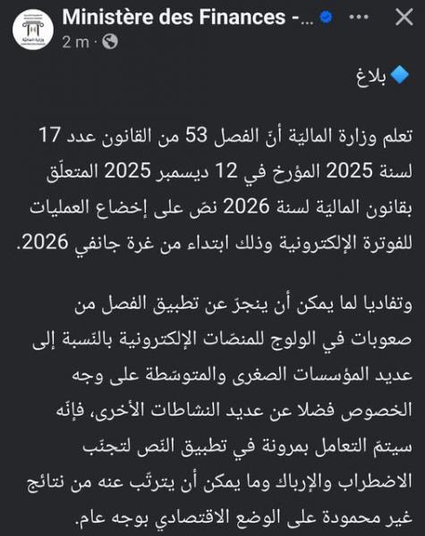 Le ministère des Finances a confirmé, dans un communiqué publié ce mardi, qu’« une application souple de l’article 53 de la loi n°17 de l’année 2025, datée du 12 décembre 2025 et relative à la loi de finances pour l’année 2026, sera adoptée ». Cet article prévoit la généralisation de la facturation électronique à partir du 1er janvier 2026.