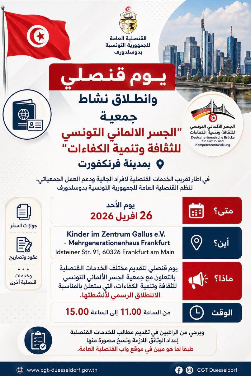Accueillie dans l’un des espaces de la ville de Francfort, cette journée consulaire, vise à rapprocher les services consulaires des membres de la communauté tunisienne, tout en soutenant l’action associative et en renforçant les liens culturels entre la Tunisie et l’Allemagne, selon une publication sur la page Facebook du Consulat général de Tunisie à Düsseldorf.