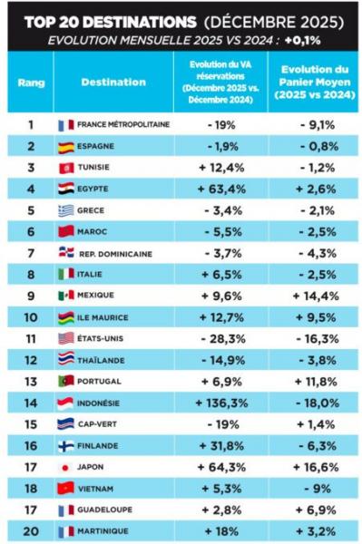 Le top 20 des destinations pour décembre 2025 révèle des évolutions significatives dans les préférences des Français en matière de voyages. Avec une croissance moyenne mensuelle de seulement +0,1 %, certains pays connaissent des hausses notables, tels que l’Égypte (+63,4 %), l’île Maurice (+12,7 %) et la Tunisie (+12,4 %). En revanche, plusieurs destinations européennes, comme la France métropolitaine (-19 %), l’Espagne (-1,9 %) ou la Grèce (-3,4 %), enregistrent des baisses de fréquentation.