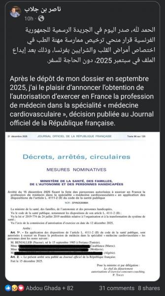 Un jeune médecin tunisien, originaire de Kasserine, a annoncé sur sa page Facebook avoir obtenu l’autorisation d’exercer en France. Son parcours illustre à la fois les ambitions des professionnels tunisiens et les défis liés à la mobilité internationale.