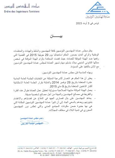 Le long feuilleton judiciaire qui oppose, depuis le mois de novembre dernier, le bureau provisoire du conseil de l’ordre des ingénieurs (OIT) présidé par Mongy Miled, au bureau élu suite à la 11ème assemblée générale ordinaire de la commission des grands électeurs présidée par Oussama Kheriji, a finalement pris fin suite à la décision de la justice.