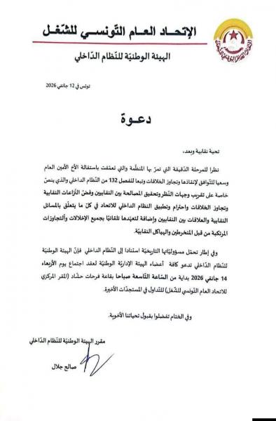 Dans un communiqué rendu public, signé par le rapporteur de l'instance nationale du règlement intérieur, l’UGTT convoque l’ensemble des membres de l’Instance administrative nationale à une réunion qui se tiendra le mercredi 14 janvier 2026, à partir de 9h00, à la salle Farhat Hached, au siège central de la centrale syndicale.