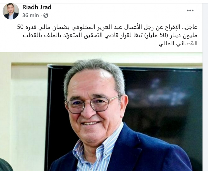 Le chroniqueur proche du pouvoir Riadh Jrad vient d’annoncer que l’homme d'affaires Abdelaziz Makhloufi a été remis en liberté contre une caution de 50 millions de dinars;