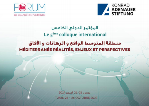 Dans le cadre de ses activités de l’année 2019, le Forum de l’Académie Politique (FOAP) et la Konrad Adenauer Stiftung (KAS) organisent au Regency Hotel- Gammarth, les 25 et 26 octobre prochain, le 5ème colloque international sous le thème: "Méditerranée. Réalités, enjeux et perspectives".