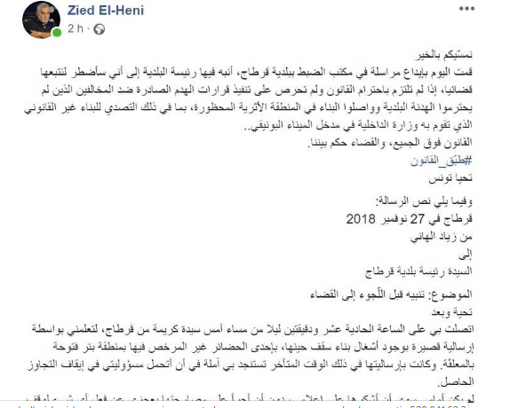 Dans un post publié mercredi 28 novembre 2018 sur sa page Facebook, Zied El Héni, activiste de la société civile et membre du conseil municipal de Carthage, a indiqué qu’il portera plainte contre Hayet Bayoudh, présidente du conseil municipal de Carthage dans une affaire de construction anarchique.