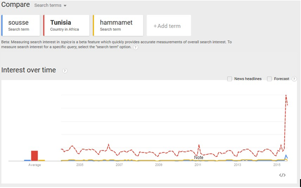 On voit bien que la tendance du terme de recherche « Sousse » en couleur bleue a dépassé celui de « Hammamet » en couleur jaune.