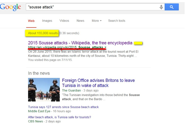 A travers la recherche, on découvre qu’il y a déjà 155 000 résultats de recherche sur « sousse attack » dont : Articles de presse, communiqués officiels, images, vidéos et autres témoignages... Il y a même une page Wikipédia, ce qui augmente considérablement la visibilité du tragique événement.