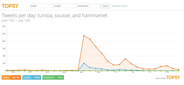 Topsy montre que le jour de l’attentat, le 26 juin, il y a près de 125 000 twitts parlant de #Tunisia et 25000 twitts évoquant #Sousse