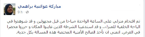 La députée Front populaire à l'ARP, Mbarka Brahmi, a révélé dans un post publié sur sa page Facebook que « des inconnus » se sont introduits de force dans son domicile ce jeudi aux environs de 1h du matin.