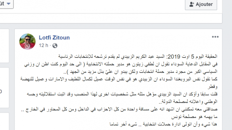 Dans un statut publié sur sa page Facebook, Lotfi Zitoun l’ancien conseiller politique du président d’Ennahdha, regrette la sale campagne de diffamation contre le ministre de la défense nationale Abdelkrim Zbidi, alors qu’il n’a pas encore déposé sa candidature à l’élection présidentielle. Il déplore cette propagande qui fait de Zbidi à a fosi l’homme des Emirats , de l’Arabie Saoudite et de Qatar et d’Ennahdha. Zitoun à qui on attribue la mission de directeur de campagne de Zbidi, considère que son poids politique est bien plus au-dessus de cela.