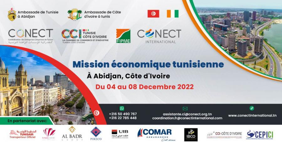 La Confédération des entreprises citoyennes de Tunisie (CONECT) en collaboration avec la chambre de commerce et de l'industrie CCI Tunisie Cote d'Ivoire et la fédération ivoirienne des petites et moyennes entreprises FIPME organisent du 04 au 08 décembre 2022 une mission économique à Abidjan.