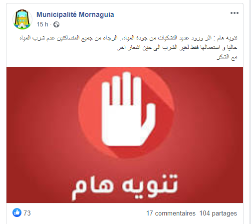Dans un communiqué rendu public vendredi 11 juillet, la municipalité de Mornaguia a mis en garde les citoyens contre la consommation de l’eau potable jusqu’à nouvel ordre. C'est que la municipalité a reçu une série de réclamations concernant l' état de détérioration de la qualité de l’eau.