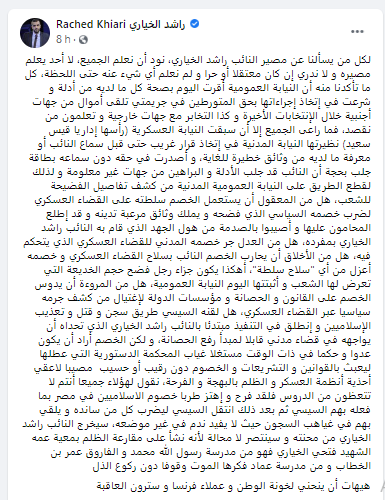 Convoqué en tant qu’accusé devant la justice militaire, le député islamiste radical Rached Khiari est porté « disparu ». Dans un statut publié sur sa page Facebook, on annonce que l’auteur de la fameuse vidéo dans laquelle il accuse le président de la république avait reçu 5 millions de dollars de l’ambassade américaine pour financer sa campagne électorale, a disparu depuis l’annonce de sa convocation. « Nous nous interrogeons sur son sort et nous ne savons pas s’il est libre ou s’il est détenu.», lit-on sur sa page qui accuse « la justice militaire d’être sous la tutelle de Kais Saied d’avoir devancé la justice civile qui s’était chargée de l’affaire pour lui couper la route afin qu’il puisse révéler le scandale au peuple ».