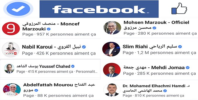 D’abord, seulement 9 candidats sur 26 ont des pages facebook vérifiées. Il s’agit de : Abdelfattah Mourou, Youssef Chahed, Mehdi Jemâa, Mohsen Marzouk, Slim Riahi, Nabil Karoui, Mohamed Hechmi Hamdi, Moncef Marzouki et Salma Elloumi.