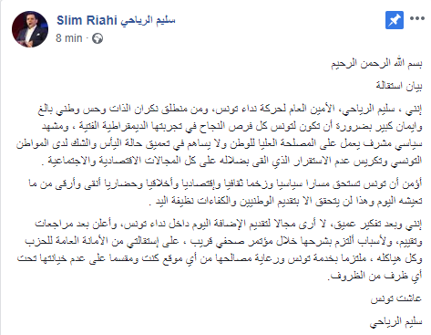 Slim Riahi, qui se trouve encore à l'étranger depuis ses accusations lancées à l'encontre du chef du gouvernement, vient d'annoncer via sa page facebook officielle sa démission de Nidaa Tounes. Il est à rappeler que le parti de l'Union patriotique libre de Slim Riahi avait décidé, en octobre dernier, de fusionner avec le mouvement NidaaTounes.