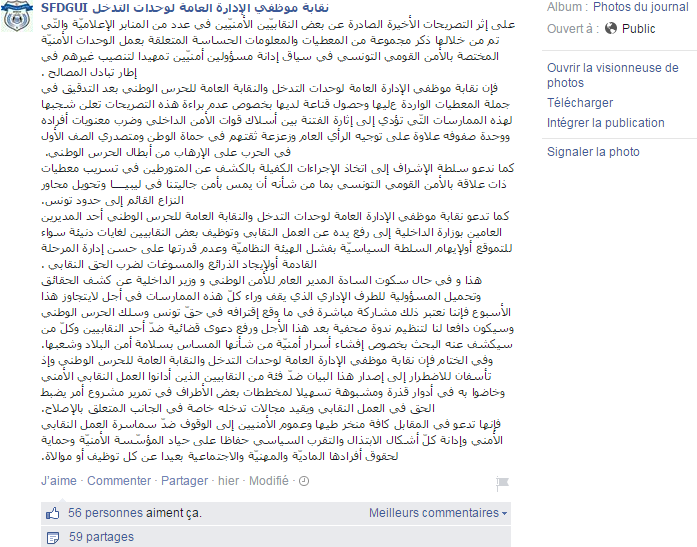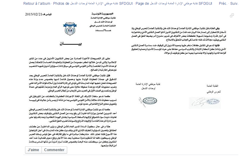 Au cas où rien ne sera fait: « on considérera leur passivité comme une participation à ces crimes et on sera obligés de faire une conférence de presse dans laquelle on dévoilera toutes les réalités et on entamera des poursuites judiciaires contre les syndicalistes qui déstabilisent les corps sécuritaires et qui divulguent les secrets de l’Etat ».