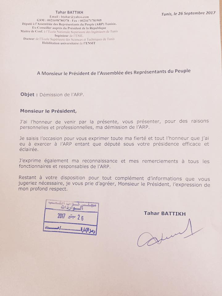 Le député Tahar Battikh a annoncé sur sa page Facebook avoir présenté sa démission de l'Assemblée des représentants du peuple. Il a publié la demande adressée au président de l’ARP et déposée au bureau d’ordre central le 26 septembre courant. Il a expliqué sa décision pour de raisons personnelles dont l’incompatibilité de la députation avec son métier d’enseignant universitaire à laquelle il va se consacrer.